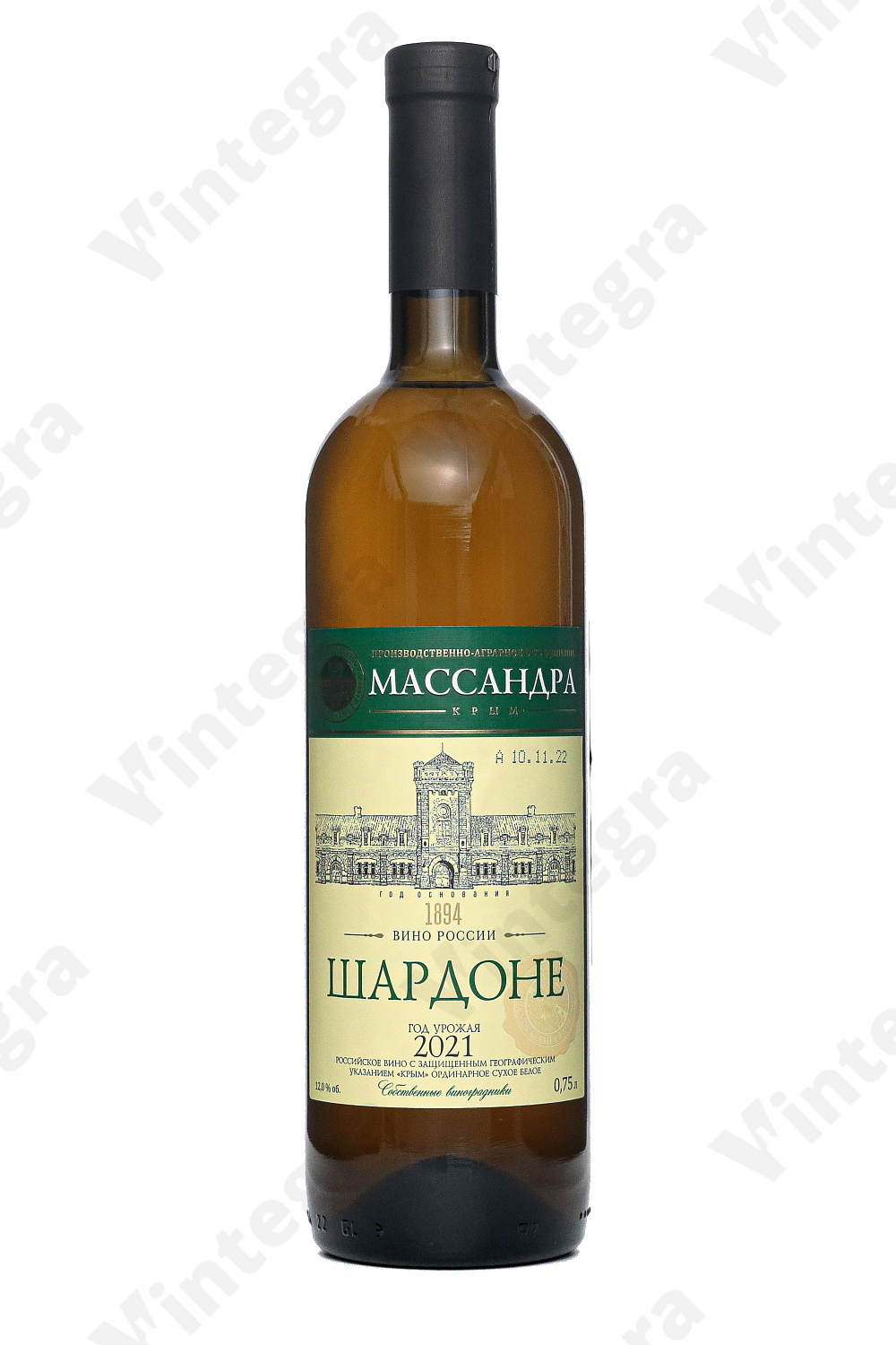 Белое вино Массандра Шардоне, 2021, сухое, 0.75 л., 12%, Россия
