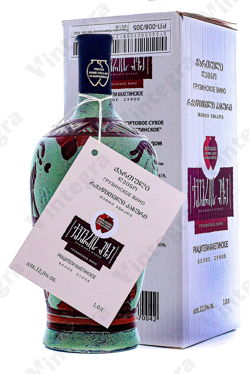 Белое вино Ркацители Кахетинское, 2022, сухое, 1 л., 13%, Грузия, керамическая бутылка, подарочная упаковка